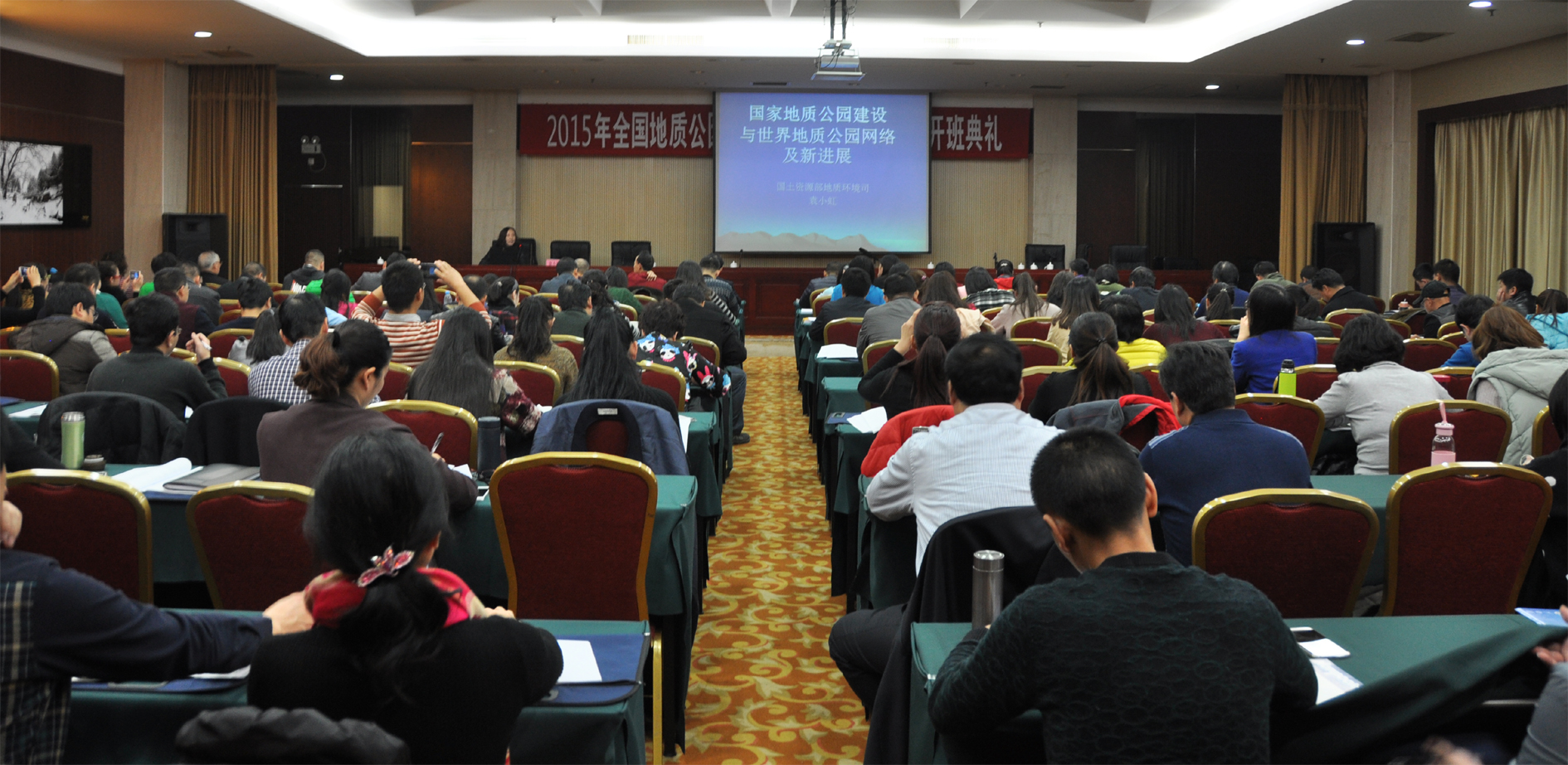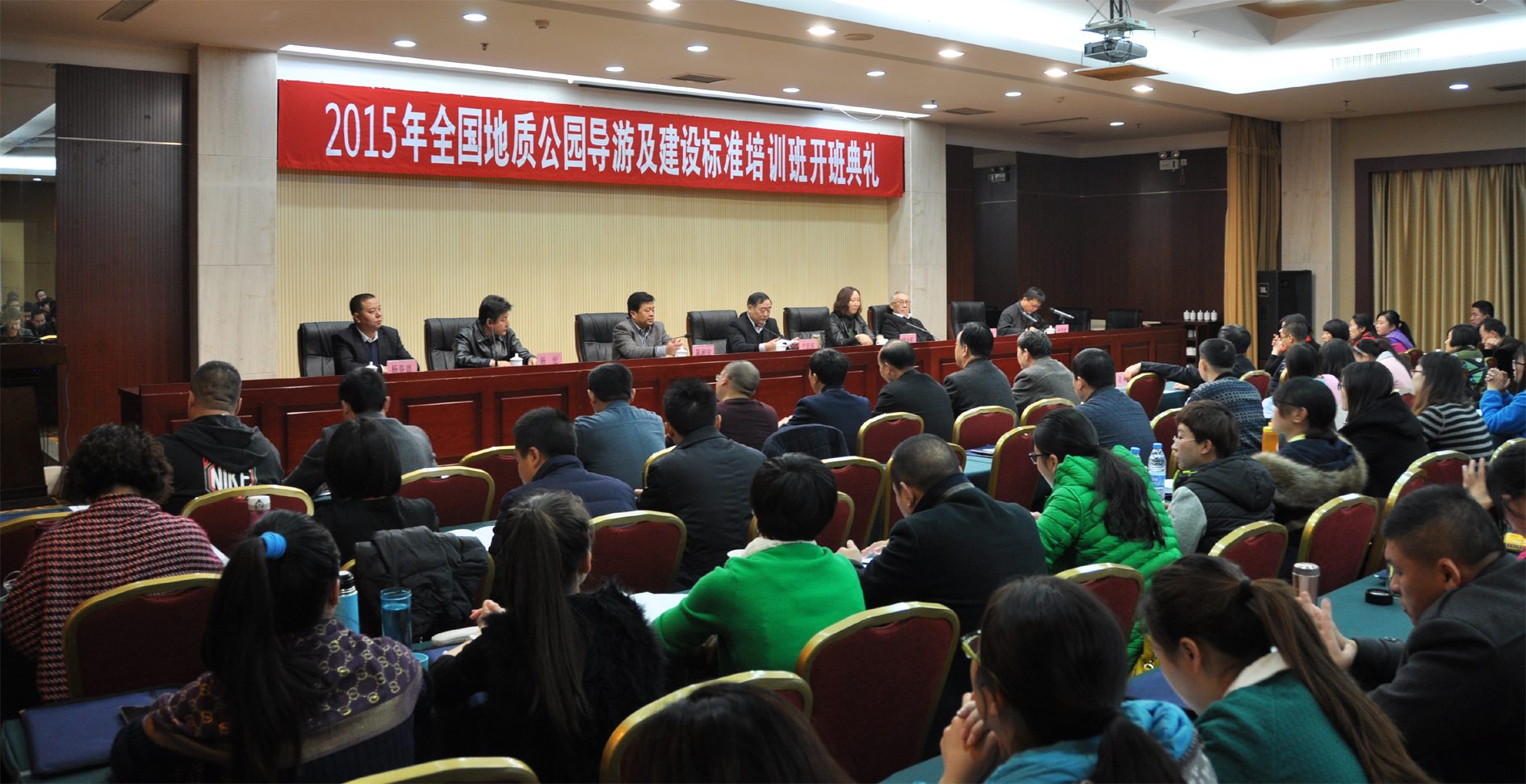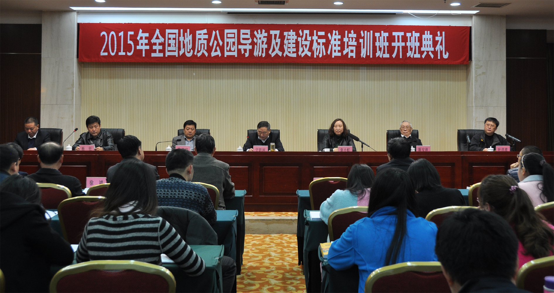 2015年全国地质公园建设标准培训班,后期于2014年11月21日在山东省泰安市虹桥宾馆开班。根据国家对国家地质公园的规划、建设及评估等方面的要求,由来自校内外的6位地质公园建设专家,对来自全国的52家世界地质公园、国家地质公园的95名地质公园管理人员进行了培训。各位学员接受了地质公园概况、国家地质公园建设标准制定原则、地质公园管理机构与规划、世界地质公园建设、世界地质公园评估、地质公园地质遗迹、科研与科普、地质公园解说与标识系统等方面的专业理论知识培训。