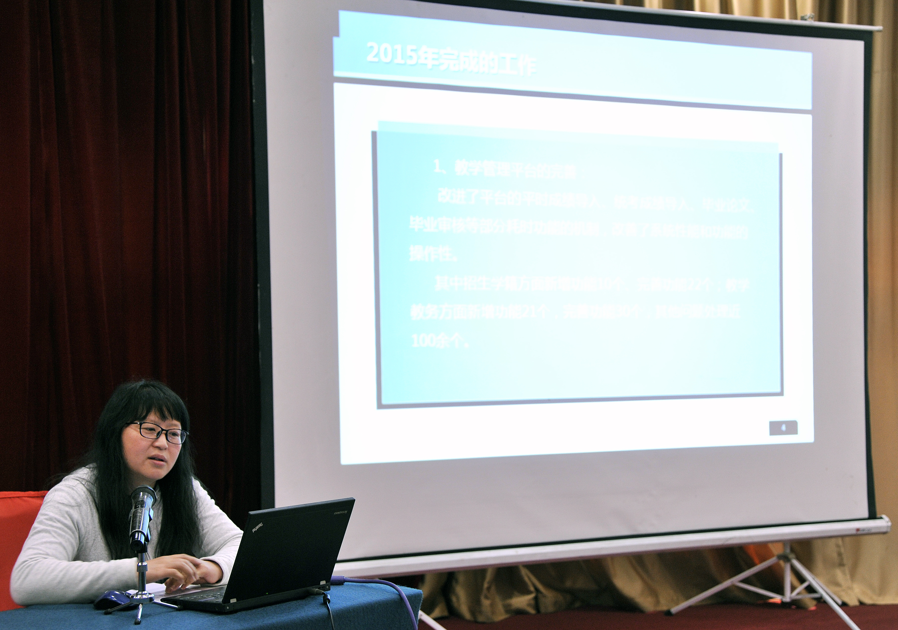 技术支持部主任蒋凌雁老师围绕2015年技术部的主要工作,对教学管理平台和新的学习平台在使用过程中出现一些问题作了总结和分析,进一步介绍了今后的工作安排,提出了与中心相互配合做好技术支持工作的建议。