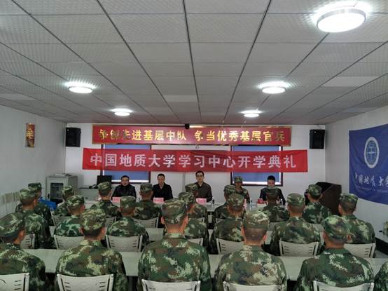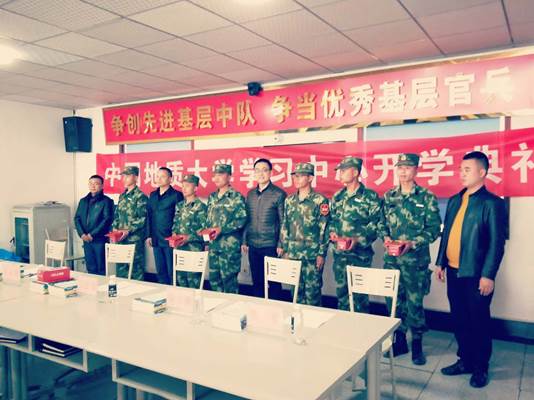 下午3点,在部队营区的大会议室,举行了隆重的开学典礼。学习中心老师宣读了学生会成员名单,主席台领导和老师为学生干部颁发了聘书,并为他们佩戴了中国地质大学校徽。2018春学生会主席,武警战士张某发言,他表示作为学生干部会认真学习,不断提高军事能力和文化知识,使自己在部队不断进步、提高,并会尽其所能服务好每一位战友和同学。贺亚锋、余必胜老师一行为同学代表发放了教材,希望同学们在站岗放哨之余好好读书,成为不仅军事强,而且知识广,能力高的有志青年,用学到的知识好好报效祖国。班主任孙川老师就两年半的学习安排,以及考试作业情况进行了详细说明,要求各位同学严格遵照学校的要求,认真学习,认真考试。