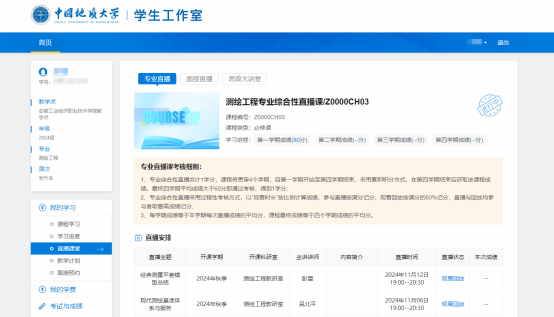 登录网址:https://cugyj.cug.edu.cn/,登录学生工作室,点击“直播课堂”进入直播课界面,选择专业直播,进入对应课程即可。