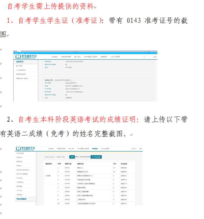 自考学生请正确无误非常清晰地上传相关资料,若提供虚假资料后果自负。若有疑问可联系考生本人的助学学校自考办及主考学校自考办。