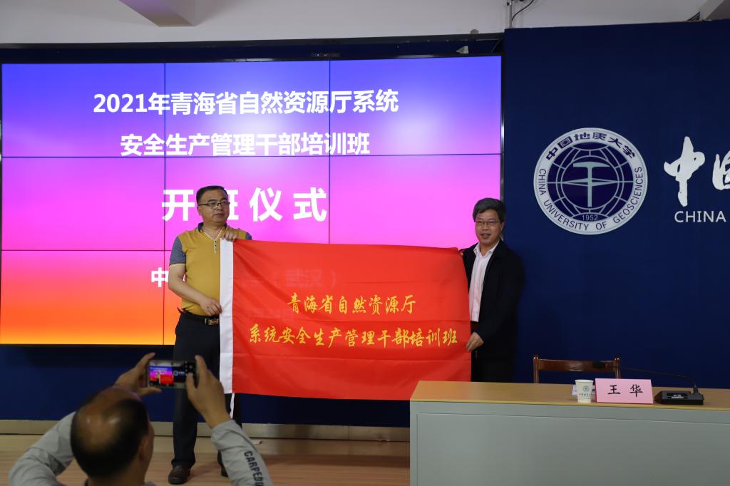 随后,王华副校长作为校方代表,向本次培训班长,来自青海省自然资源厅总督察办公室的于雪勤处长授予班旗。