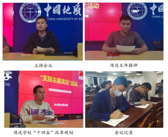 (供稿: 地质调查基础理论培训二班,编辑、摄影:马汝强)10月28日,远教学院地质调查基础理论培训班临时党支部(以下简称“临时党支部”)开展“支部主题党日”活动。活动由二班党支部书记李培军同志主持并传达《关于开展2021年10月份“支部主题当日” 活动的通知》;一班党支部书记刘占迎同志传达《习近平总书记在中央人大工作会议上的重要讲话精神》 、《习总书记在中央人才工作会议上的重要讲话》;三班党支部书记刘雁峰同志传达《习总书记在辛亥革命110周年大会上的重要讲话》和学校《“十四五”事业改革与发展总体规划》。临时党支部102名党员参加了本次活动。