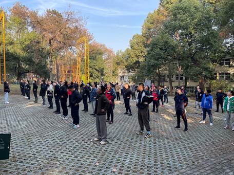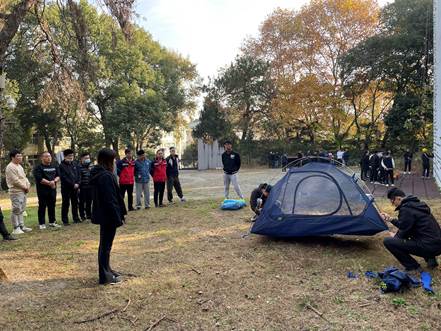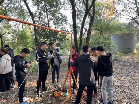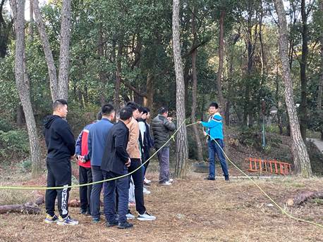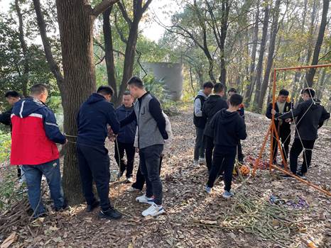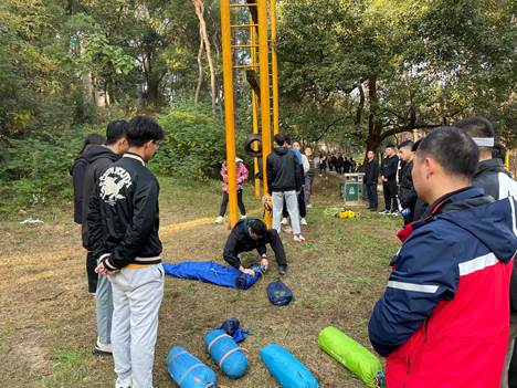 我校体育学院周云老师给全体学员讲述了野外工作可能遇到的突发情况,以及应对办法,并带领全体学员在我校户外生存训练基地进行实操训练。