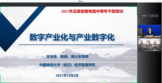 123日至4日,我校池毛毛、郭兰、宋小青、田熙科等四位专家教授,在我院演播室,分别就《数字产业化和产业数字化》《情绪管理与压力控制》《碳中和引领整合空间与资源的国土多功能转型》《加快农业产业转型升级,促进施甸经济发展----富硒农业》等四个专题,通过腾讯会议视频直播讲座,来自施甸县各乡镇、县直各单位的45名中青年干部,在当地集中同步视频参加了培训。
