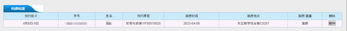 2.在对应课程后点击“预约面授课”或“预约直播课”并提交,即可完成预约。已预约的课程将显示在页面下方的“约课结果”栏中。