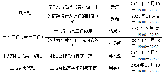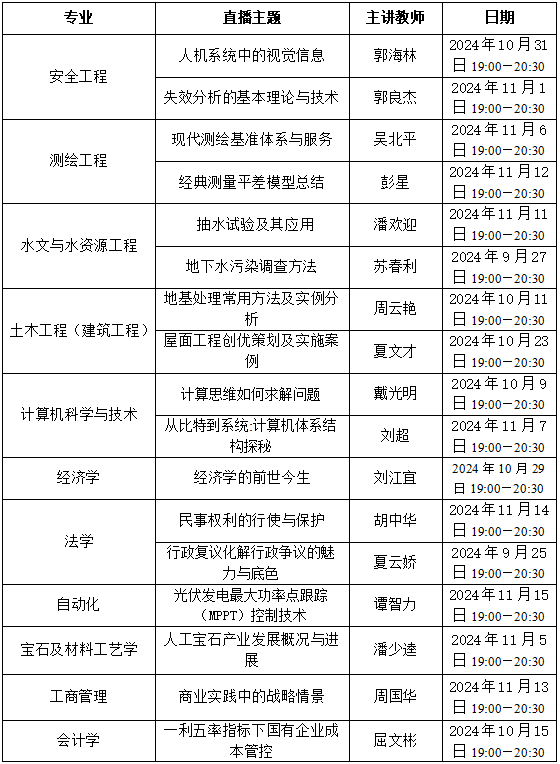根据2024年秋季学期教学进度,各专业综合性直播教学安排已确定请各位同学按时参加学习。