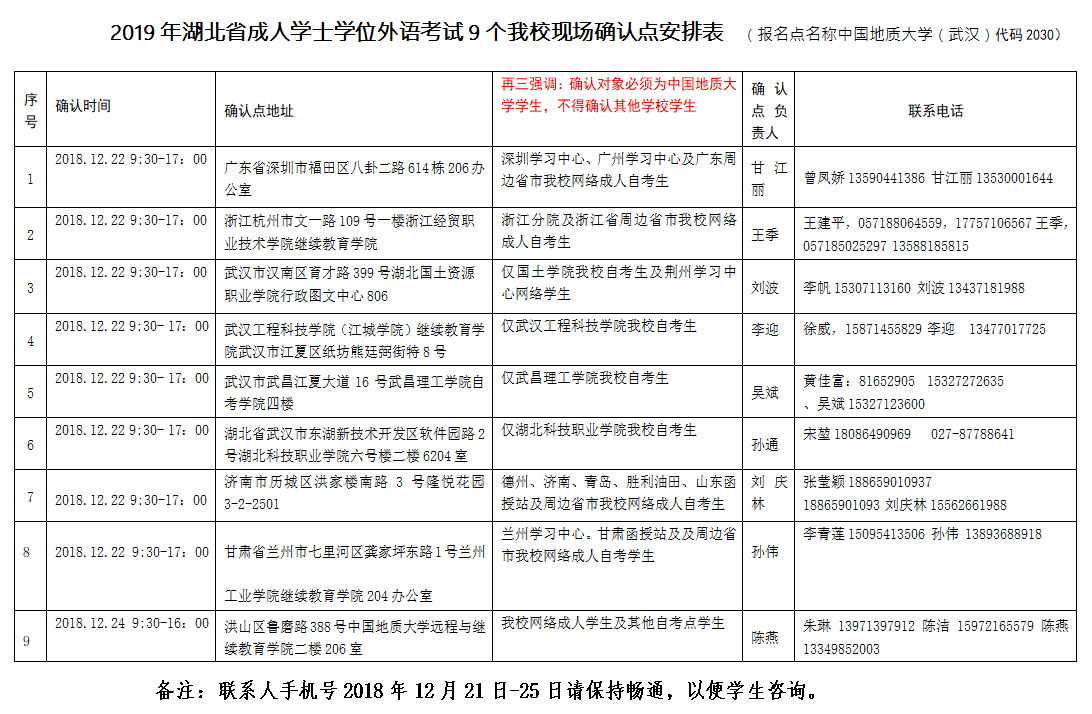 2. 现场报名确认时间和地点:2018年12月22日、24日,我校学生严格按照通知中发布的《2019年湖北省成人学士学位外语考试现场确认点安排表》前来确认。