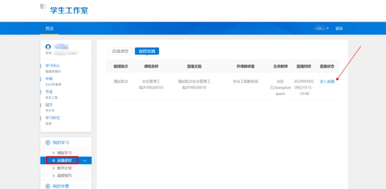 (1)登录学院主页“学习管理系统”, 在左侧功能列表内点击“直播课堂”。