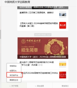 (1)关注学院公众号“中国地质大学远程教育”,点击“关于学院”,选择“学历微平台”,输入账号和密码(账号为身份证号,默认密码为身份证后六位),绑定移动学习平台,进入移动学习界面。