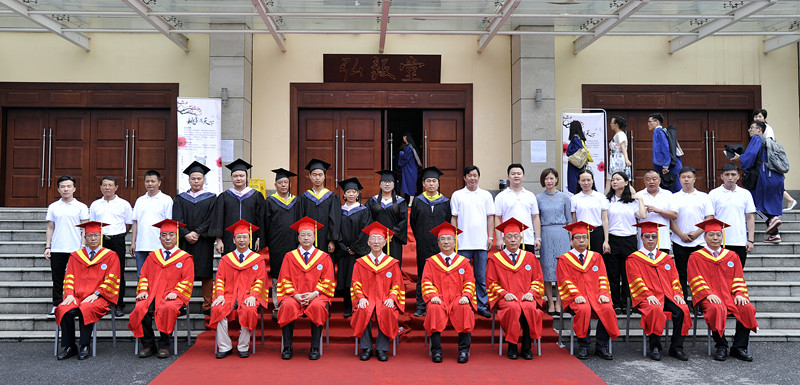 毕业生代表们与院士、校领导在弘毅堂正门前合照。