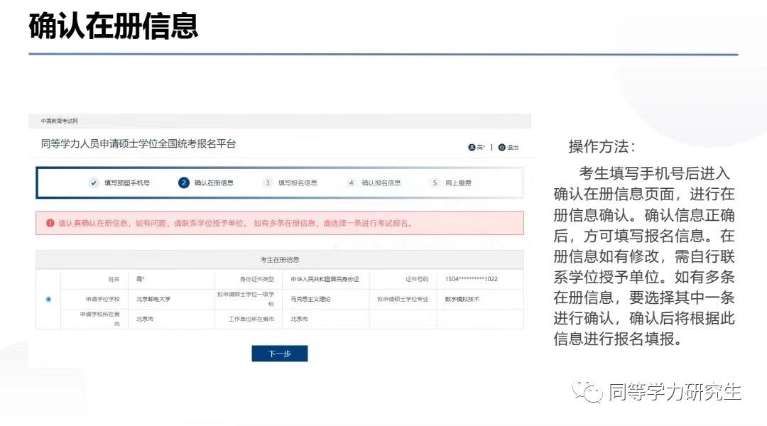 考生填写手机号后会进入确认在册信息页面,确认信息正确后,方可继续填写报名信息。在册信息如有修改,需自行联系学位授予单位。如有多条在册信息,要选择其中一条进行确认,确认后将根据此信息进行报名填报。