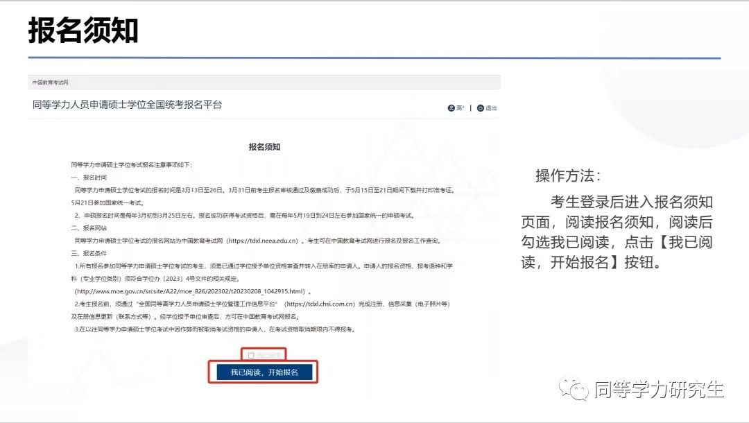 考生登录后会进入报名须知页面,请仔细阅读报名须知,阅读后勾选我已阅读,点击【我已阅读,开始报名】按钮。