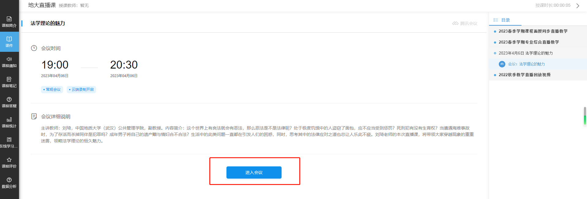 (3)进入直播课堂界面后,选择“专业综合直播教学”,本学期开课列表。点击“进入会议”即可跳转至直播界面。