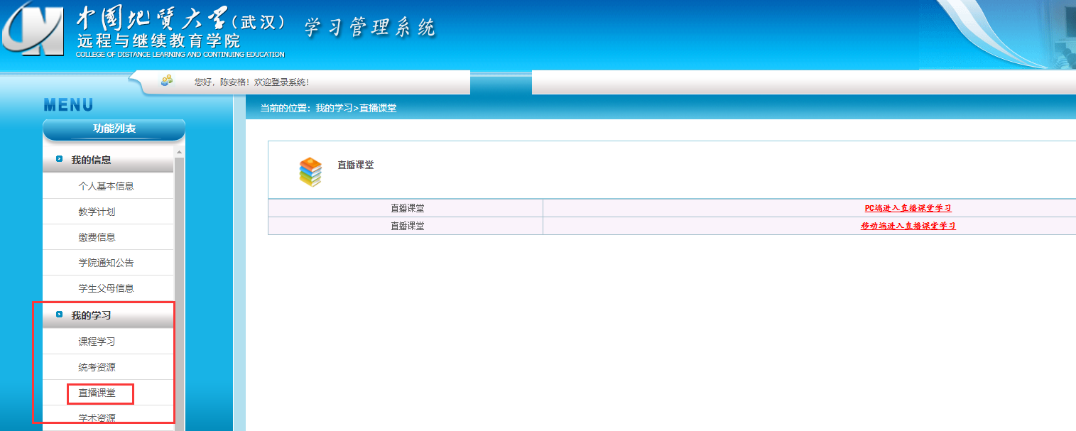 (2)手机登陆方式:打开手机浏览器,搜索“中国地质大学WilliamHill威廉希尔”,点击“学生入口”登陆学习管理系统,选择“直播课堂”,点击“进入直播课堂学习”。